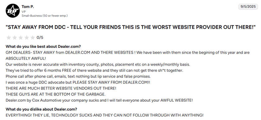It is widely used by franchise dealers who want marketing handled with minimal internal effort. Reviews highlight dependable website uptime, OEM-aligned layouts, and structured ad programs tied to manufacturer rules. Dealers appreciate having one vendor manage search, display ads, and inventory pages without constant oversight.